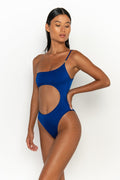The Bonita in Olympus by Sommer Swim is a one shouldered one-piece with a cut-out feature through the centre, unique gold embellishment and a cheeky cut.